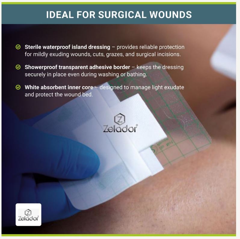 Sterile adhesive waterproof island dressings in various sizes
